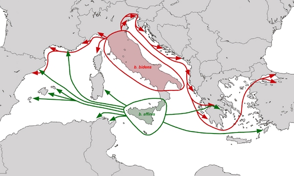 It is assumed that Papillifera bidens has been distributed in most cases by man (ship traffic of Romans and Venetians).