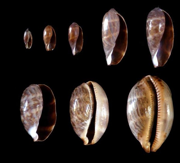 Shell growth in the cowry shell Mauritia arabica, from juvenile stage (upper