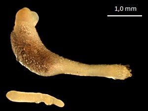 Among the shell-less molluscs ("Aplacophora") there are about 340 of the most primordial molluscs to be found on earth. As their scientific name Aplacophora literally states, the members of this group actually are devoid of a shell and in that regard are unique among molluscs. Instead of a shell, their exterior is protected by a sturdy skin, the cuticula, reinforced with calcareous spines or scales, which give the creature a glossy sheen.