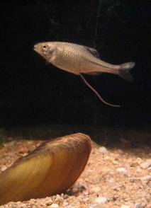 During breeding time the male bitterling selects itself a suitable mussel, which it defends against other males. The female on the other hand at this time grows a 5 - 6 cm long laying tube behind the anus opening.