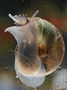 Valve snails are very small fresh water snail, equipped with a special feather-like type of gill the can extend from their pallial cavity. Possibly to clean this feather gill, valve snails also have a thread-like appendage at their disposal, the pallial tentacle. This as well they extend from their pallial cavity. The exact function of the pallial tentacle, however is not yet known.