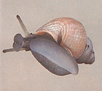 Many sea gastropods, however, such as the common whelk (Buccinum undatum) displayed in the picture on the left, to a larger extent than their terrestrial relatives, are predators and carrion eaters. The whelk, for example, attacks mussels and pushes its foot between their shell halves, before the surprised mussel is able to close up. Afterwards the whelk feeds on its prey without the latter being able to help itself. With its siphon erect, containing many olfactory sense cells, the whelk afterwards crawls its way on the search for more prey, which it is able to smell from the water it breathes.