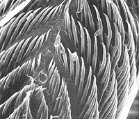 ![]() ![]() ![]() Electron microscope pictures of different terrestrial snails' radulae. From left to right: a, b: Roman snail (Helix pomatia); c: Lusitanian slug (Arion vulgaris). Source: Salzburg University (Josef Ramsauer). |