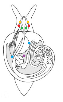 ganglia. Green: Pedal ganglia. Blue: Parietal ganglia. Violet: Visceral ganglion.