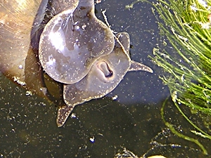A pond snail (Lymnaea stagnalis) grazing the algae on the water surface. Note the visible radula! [RN] |