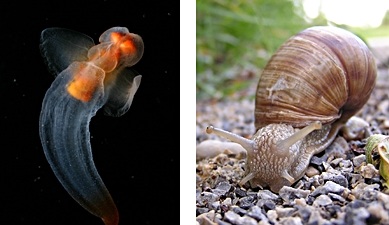 ![]() Different in every regard, but nevertheless both are gastropods. Left: Sea angel (Clione limacina), right: Roman snail (Helix pomatia). Pictures: Kevin Raskoff (Source), left, and Cornelia Kothmayer (right). |