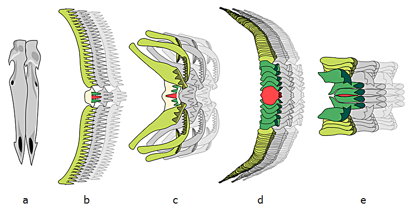 a: toxoglossan (Conidae). b: stenoglossan (Muricidae). c: taenioglossan (Naticidae). d: rhipidoglossan (Trochidae). e: docoglossan (Patellidae). Source: Wikipedia. Inscription: [RN].