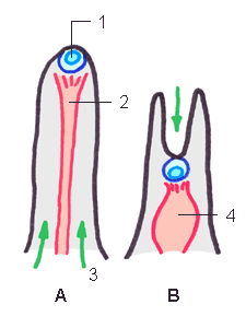Each of the snail's tentacles is equipped with an own withdrawing muscle, the retractor (picture on the right, 2). If the snail contracts the muscle (4), the tentacle is withdrawn and like a glove's finger, disappears inside the head (B). Especially in juvenile snails which still are quite transparent, the eye (1) can be seen as a black spot moving inside the tentacle.