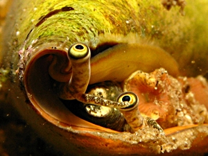 In contrary to that the snails breathing with gills can be seen, living in the sea and in fresh water. The so-called prosobranch gastropods have a shell lid and also separate sexes, different from the hermaphroditic pulmonate snails. Concerning their tentacles, especially the fresh water mud snails (Viviparidae) are interesting.