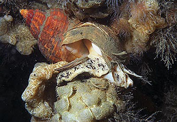 ![]() A common whelk's (Buccinum undatum) sipho is not only used to provide the snail with breathing water, but with a means to orient for food, other whelks or enemies. Picture: Peter Jonas, Unterwasser-Welt Ostsee. |