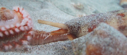 ![]() The cone shell (Conus cedonulli, right) attacks a polychaete sea worm (Hermodice carunculata, left), Picture: David Touitou. |