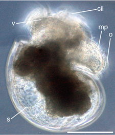 ![]() Veliger larva of Aeolidiella stephaniae. Source: Kristof, Klussmann-Kolb (2005). |