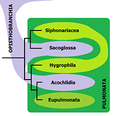![]() Relationships between opisthobranchs (Opis- thobranchia) and pulmonate snails (Pulmona- ta). [RN] After: Jörger et al. (2010). |