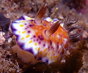 Probably best known among sea slugs are the very colourful forms of nudibranchs (Nudibranchia), the diversity of which keeps on astonishing divers in all parts of the world. Nudibranchs, like all gastropods cannot see colours. But many sea slugs have defensive or even toxic compounds at their disposition, mostly acquired with the food (such as blue algae, Cyanobacteria). Against this background, the colours of sea slugs can be understood as a warning pattern to prevent those slugs from being eaten by fish. Unpoisonous slugs profit from the general warning, as the fish has no possibility of knowing whether a colourful sea slug is poisonous or not.