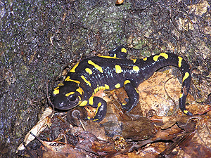 ![]() Fire salamander (Salamandra salamandra), a female. [RN] Note the snail below the salamander's head! |