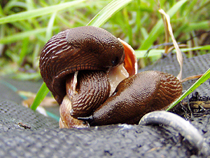 ![]() Several slugs (Arion vulgaris) "assault" Roman snail (Helix pomatia). Picture: Monika Samland. |