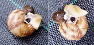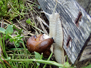![]() Lusitanian slug first attacking a Roman snail from above in the "neck" to then feed on it from inside. ( Picture: Monika Samland. |