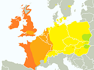 ![]() Distribution of Helix pomatia and its relatives in Europe: Orange: Cornu aspersum. Yellow: Helix pomatia. Green: Helix lutescens. Light orange; Area where both pomatia and asper- sum are found. The map is restricted to the area discussed by KERNEY et al. 1983. |