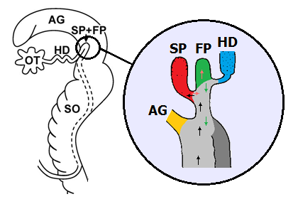 duct; SP + FP: Seminal pouch and fertilisation pouch; SO: Spermoviduct; G: