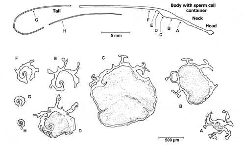 In the picture above, sections G and H are supposed to be 4 and 8 cm away from the spermatophore body proper, so the spermatophore of Helix pomatia is about 11 cm long including its tail.