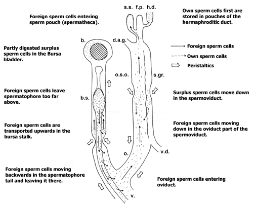 ![]() Illustration: The sperm cells' path after copulation. Legend: b.: Bursa copulatrix pouch; b.s.: Bursa stalk; d.a.g: Albumen gland duct; s.s.: Sperm pouch; f.p.: Fertilisation pouch; h.d.: Hermaphroditic duct; o.s.o.: Oviduct part of the spermoviduct; s.gr.: Seminal groove (Spermatic duct); o: Oviduct as such; v.d.: Vas deferens. Source: Lind (1973). |