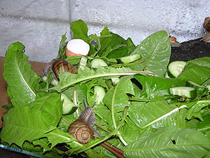 Snails are also fed with cucumber slices. |