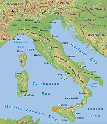 ![]() Appearance of Helix ceratina (red) and Cornu mazzullii (orange). Source: Physical Map of Italy, equirectangular projection. |