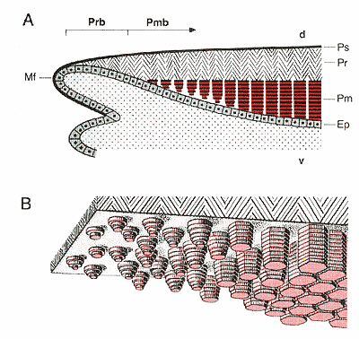 ![]() Growth of a (bivalve) mollusc's shell: A: Schematic longitudinal cut through the area of shell growth. B: Three-dimensio- nal view of wall growth. Prb: Ostracum growth; Pmb: Hypostracum growth. Ps: Pe- riostracum; Pr: Ostracum; Pm: Hypostracum; Ep: Pallial epithelium. d: dorsal; v: ventral. Source: Wehner, Gehring: Zoologie (1995). |