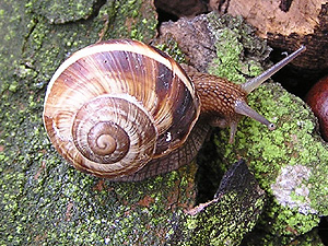 ![]() The growth stripes on this Roman snail's shell show one day's growth. Photo: Robert Nordsieck. |