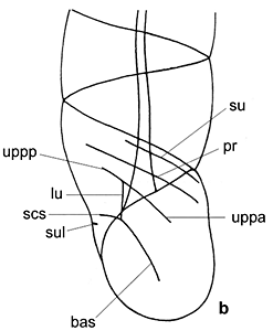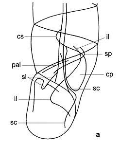 Upper lamella oder parietal lamella (sul), and spiral lamella (spl). Lower lamella (Columellar lamella, il) and Subcolumellar lamella (scl). The area between upper and lower lamella is called interlamellar. At the suture between whorls a parallel lamella (pll) is often found. The clausilium is made of a stem (cs) and a plate (cp).